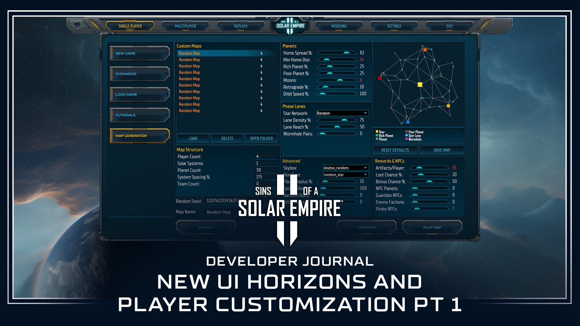One of the biggest additions with this update is one of our most requested features since launch: the in-game map generator. We have put a fair amount of work into bringing back the in-game “Map Designer” from Sins 1. It gives you sliders for the basic controls of galaxy generation and allows you to control a nearly infinite number of systems at the click of a button. Each input has a tooltip and range to give you a thorough understanding of what you are editing. We have made additions to the Drop-in Scenario system, so maps that are generated are immediately available to use without reloading or restarting. Each slider has a range from low to very extreme, with colored indicators that signal you may be going off the deep end. However, we will not stop you from creating very large maps. Performance in an extreme map is heavily dependent on your PC’s capabilities, so create galaxies at your own peril.